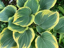 L, листья с сине-зеленым центром и широкой желтой каймой, сердцевидные, плотные