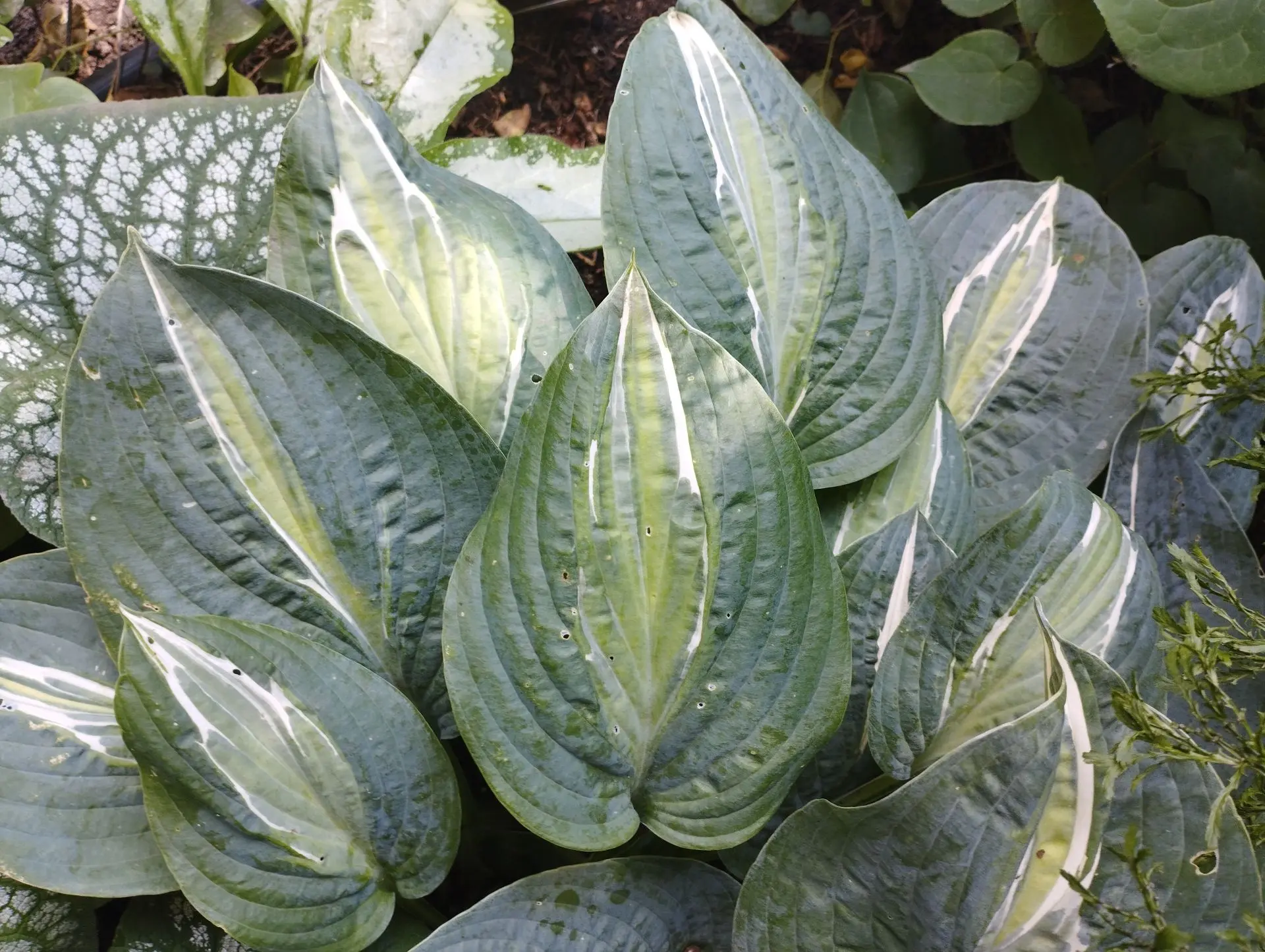 M, лист овальный, голубовато-зеленоватый с желто-зеленым центром, отделенные белой, перистой линией