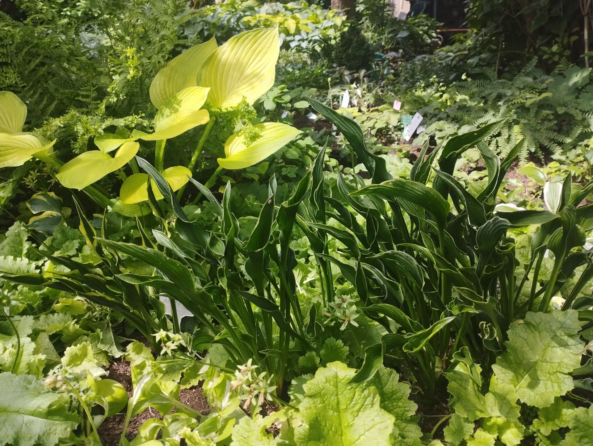 У нас растет с примулами Зибольда, маленькими и миниатюрными хостами, маленькими астильбами и маленькими папоротниками, фиалками, маленькой купеной, маленькими горянками.