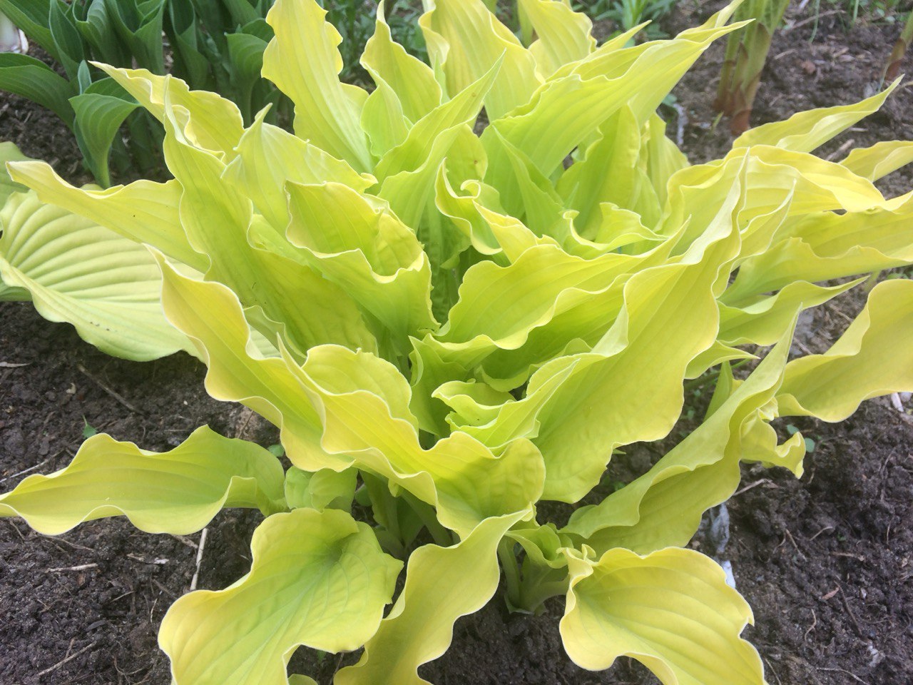 Высота 25-30 см, размер S-M, листья желтые, ланцетные, волнистые. У нас растет в легкой полутени. Особенно хороша в первой половине лета.