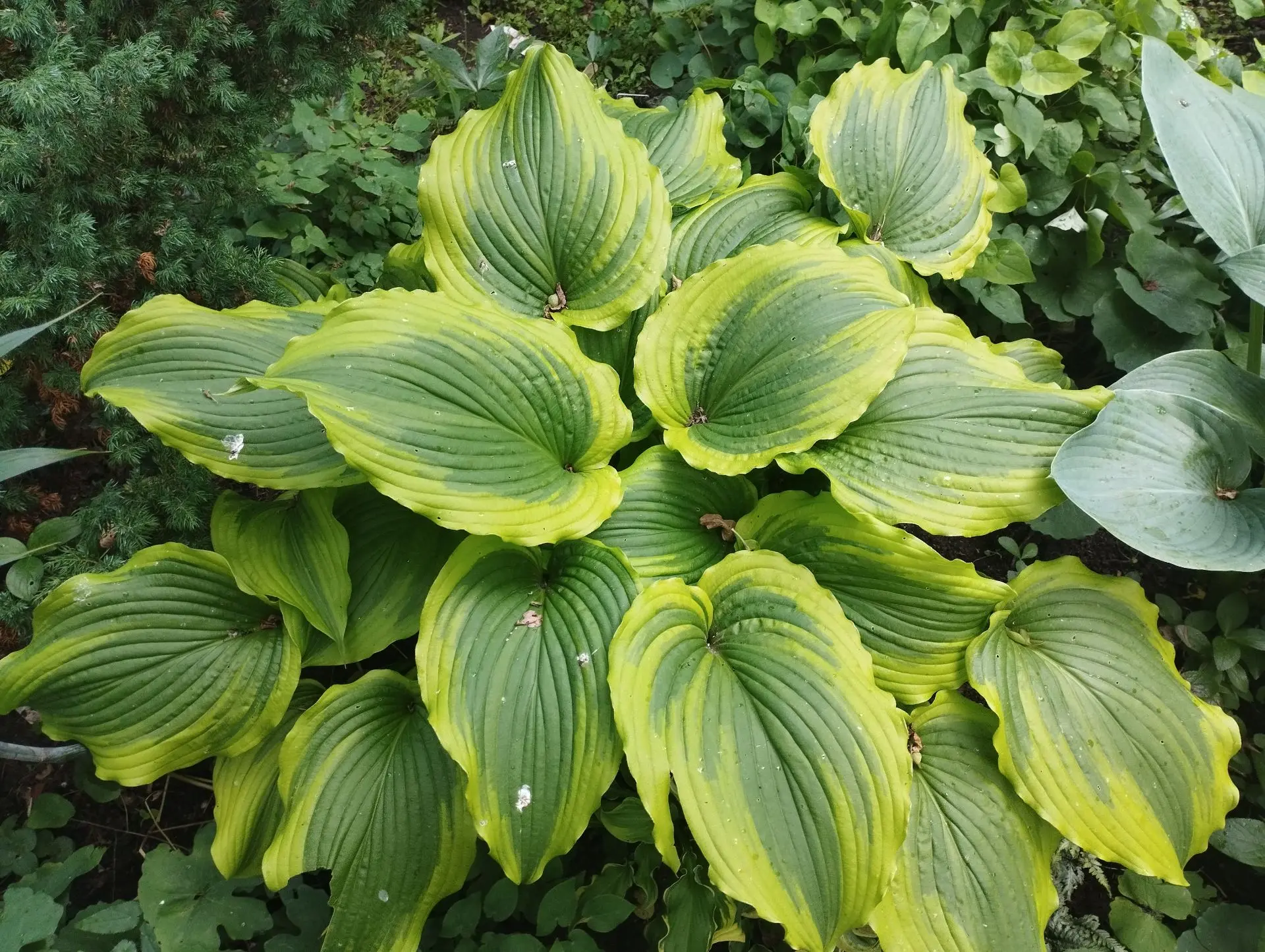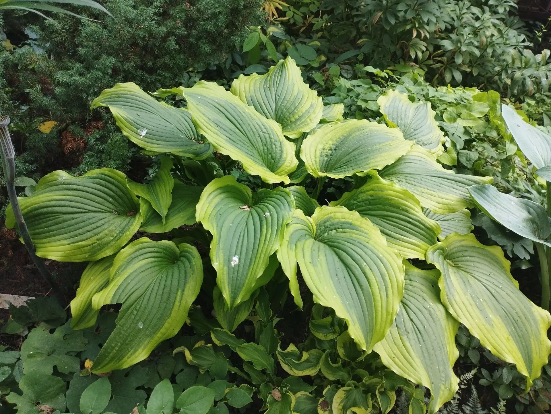 M-L. листья с темно-зеленым, перистым центром и широким желто-шартрезным, волнистым краем, овально-сердцевидные