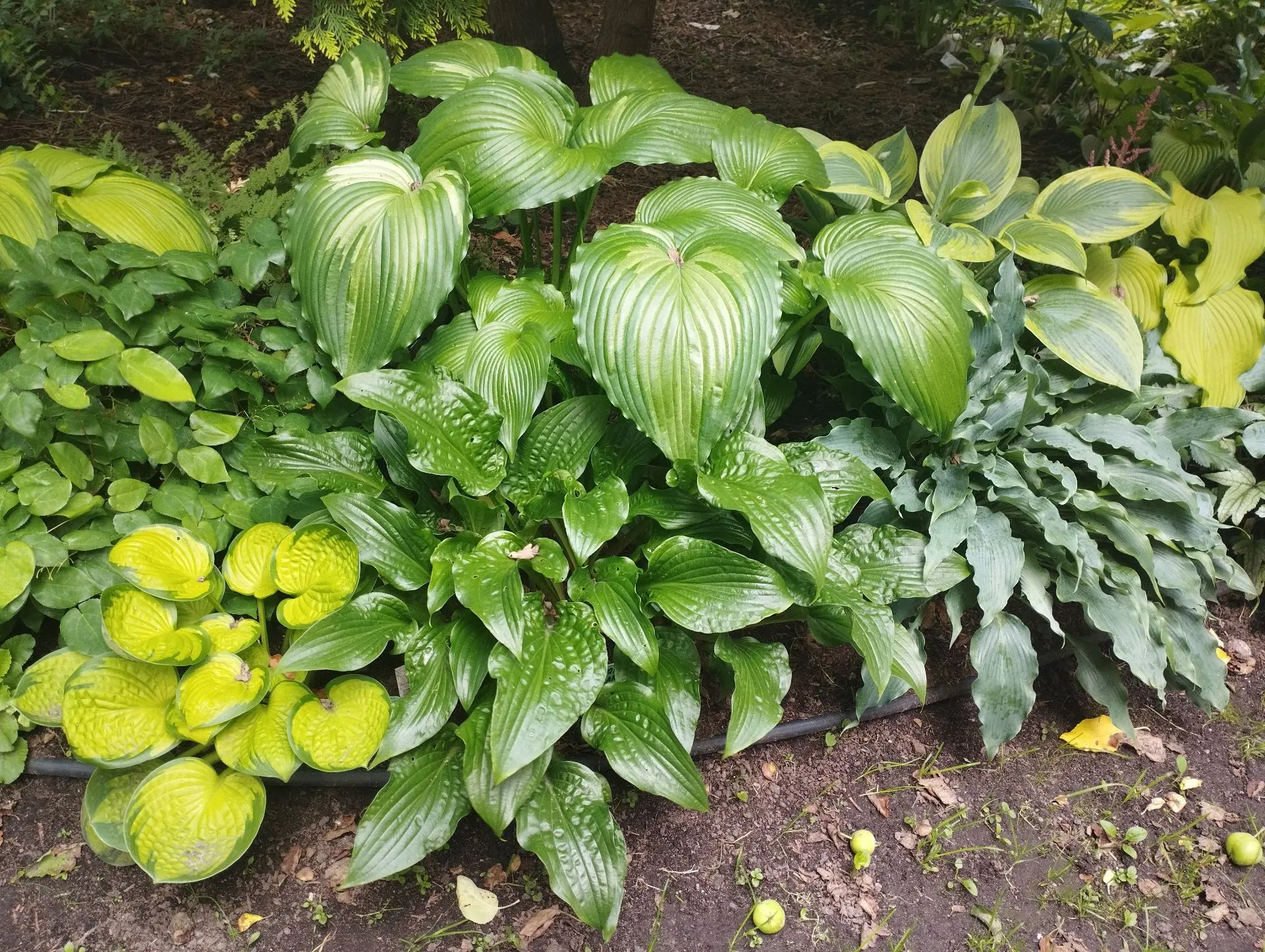 Мы посадили эту хосту на переднем плане рядом с горянками, другими хостами, папоротниками, медуницей и купеной Striatum. Вся композиция находится в полутени.