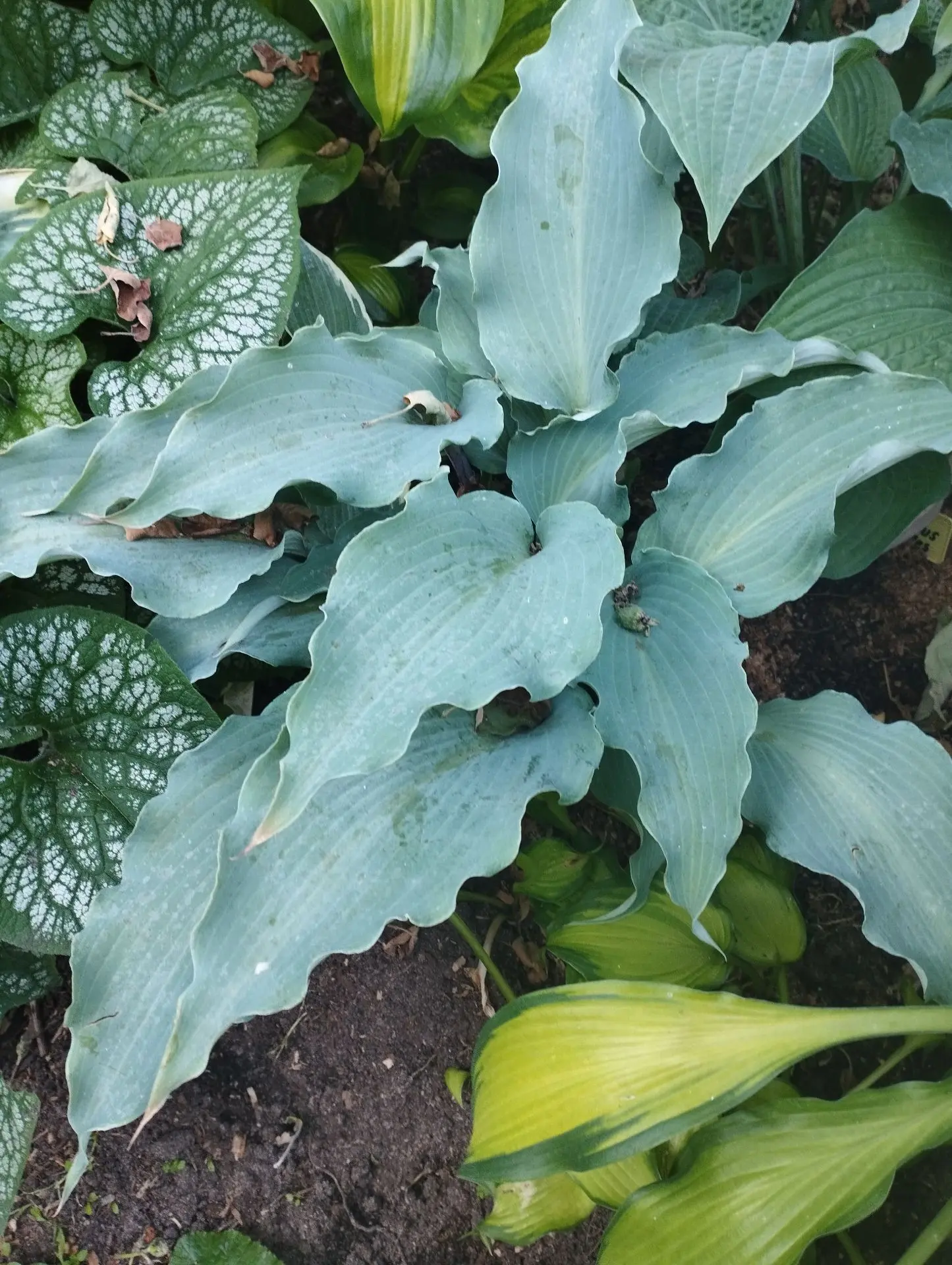 Высота 35-40 см, листья ланцетно-овальные, плотные, стальные, голубые с волнистым краем на пурпурных черешках.