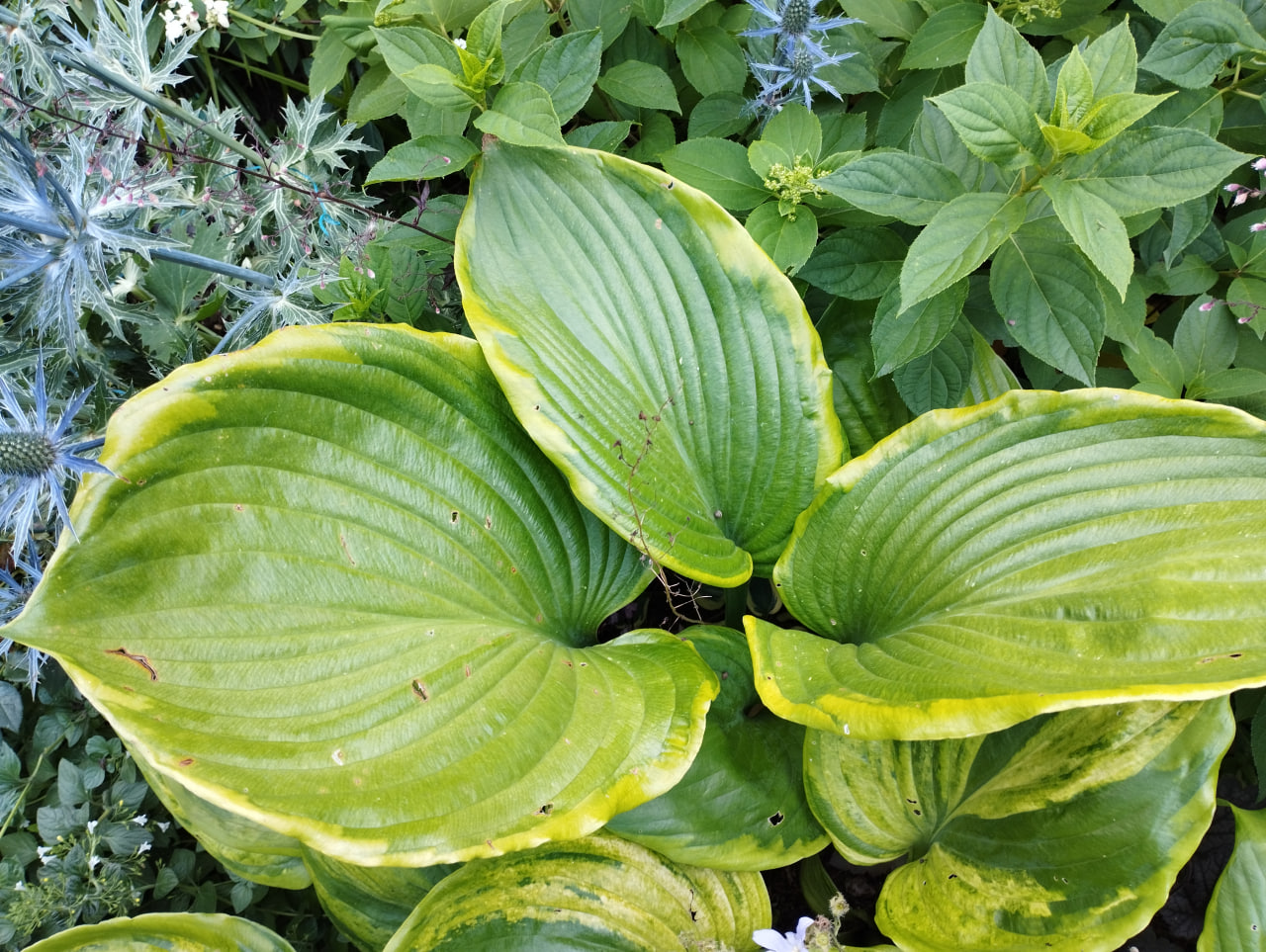 Композиция из хост Gunter prize, Ufo, синеголовника Big blue и колокольчика Prichards variety