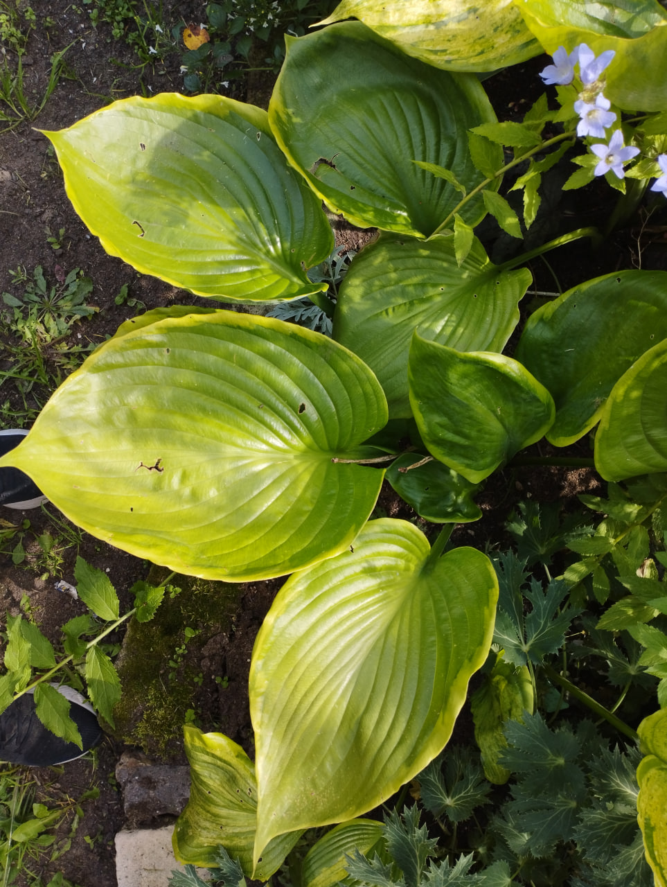 G, лист сердцевидно-чашевидный, глянцевый, крупный, зеленый с тонкой желтой каймой