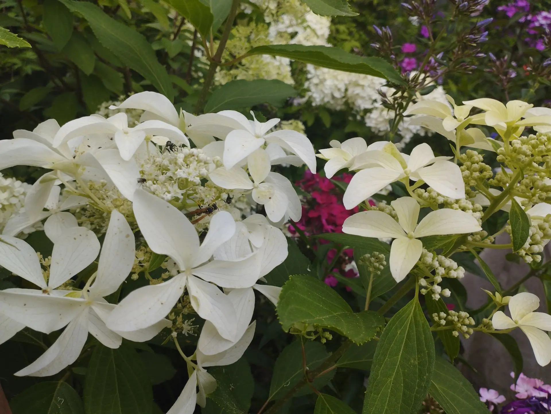 Гортензии Bobo, Grear star; аконит Napellus; эхинацеи Raspberry and cream, Double white, Double pink в саду Гриндачи в 2023 году.