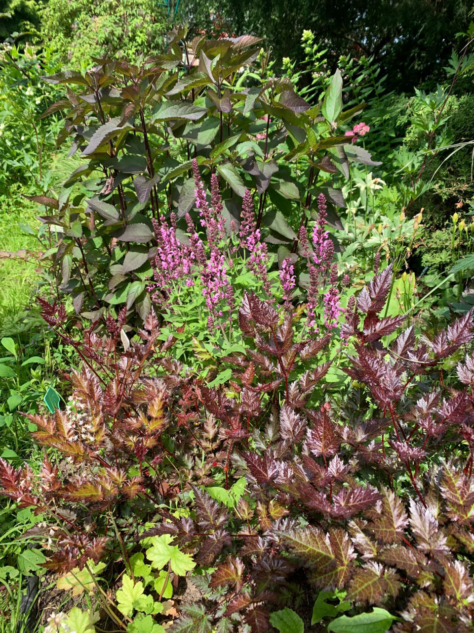 Высота с цветоносом 45 см, высота листвы 25 см. Цветы насыщенного розового цвета. Цветет в июле-августе. В начале лета листья прокрашиваются в бордово-коричневый цвет . Во время цветения цвет листьев становится менее насыщенным. К осени проявляются бордово-красно-зеленые оттенки.