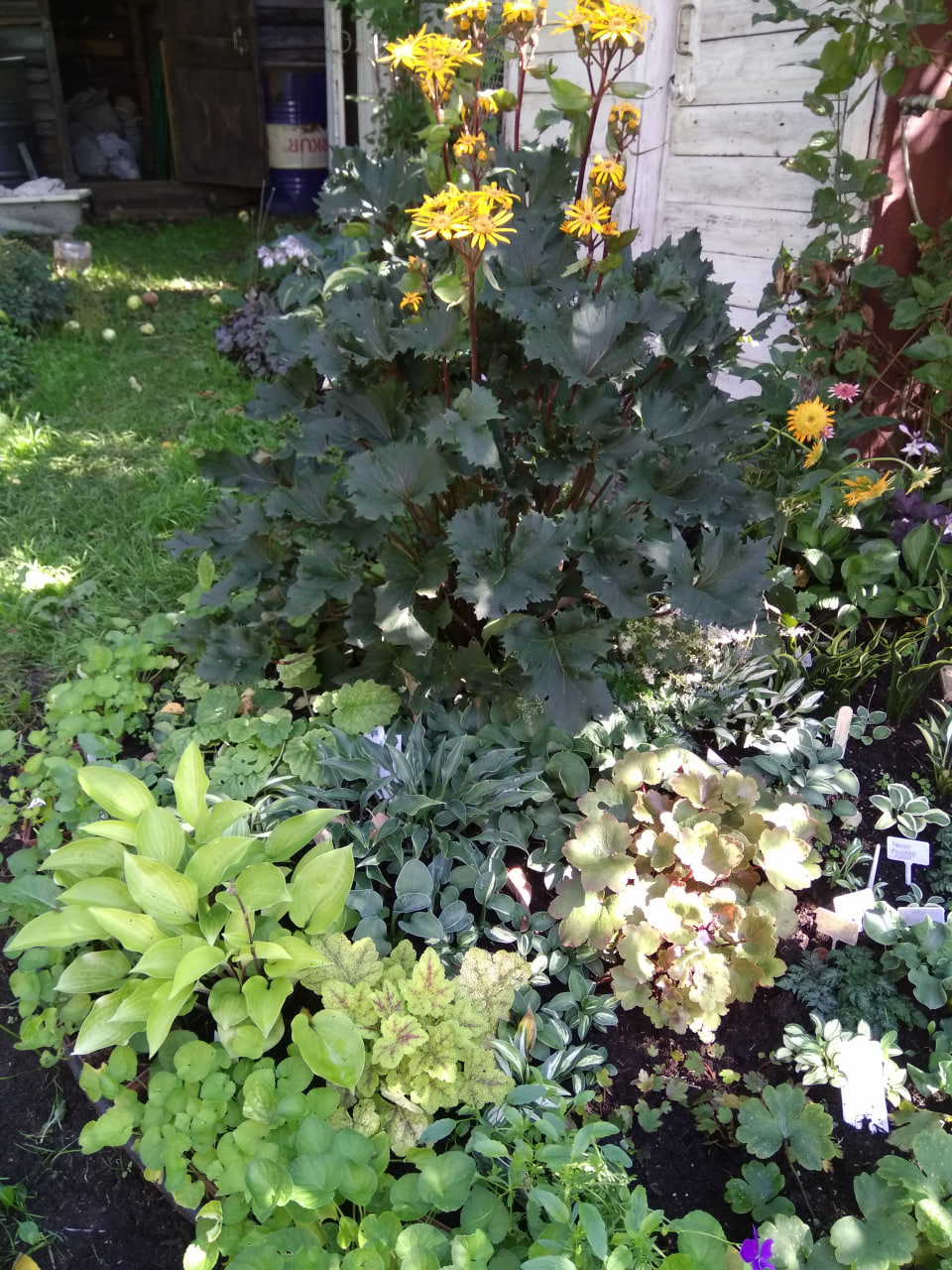 Рядом можно посадить роджерсию, астильбы, хосты, папоротники ( если композиция в полутени)