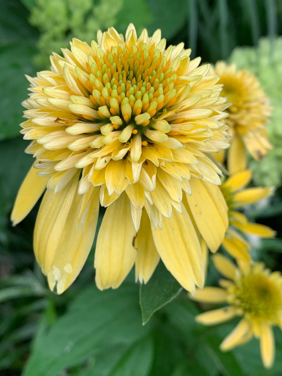 Высота 50см, цветы лимонно-желтые с зеленой макушкой, махровые, ароматные. Цветет июль-август.