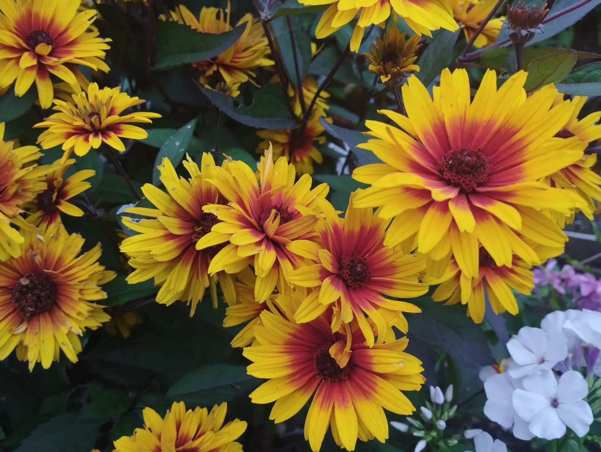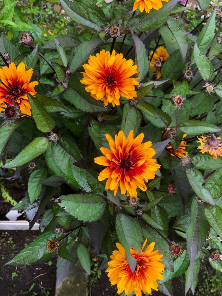 h-80, цветы полумахровые, красно-желтые, листья щоколадно-фиолетовые. Цветет июль-сентябрь