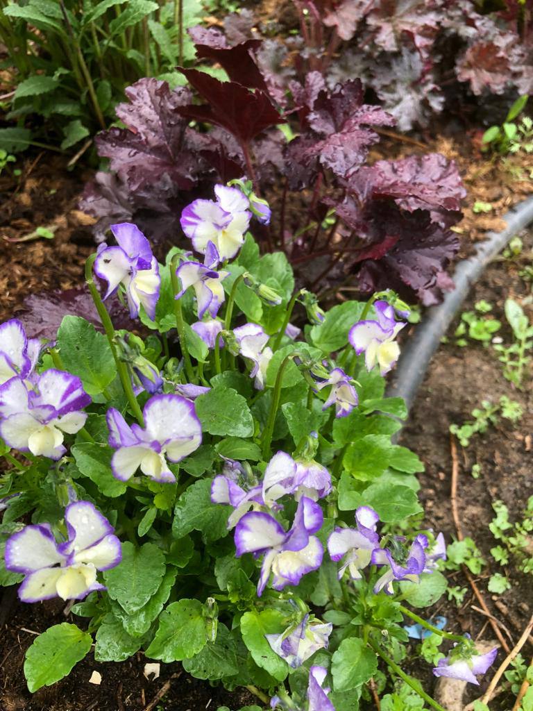 Фиалка Rebecca, гейхера и гилления Pink profusion в саду Гриндачи в 2023 году