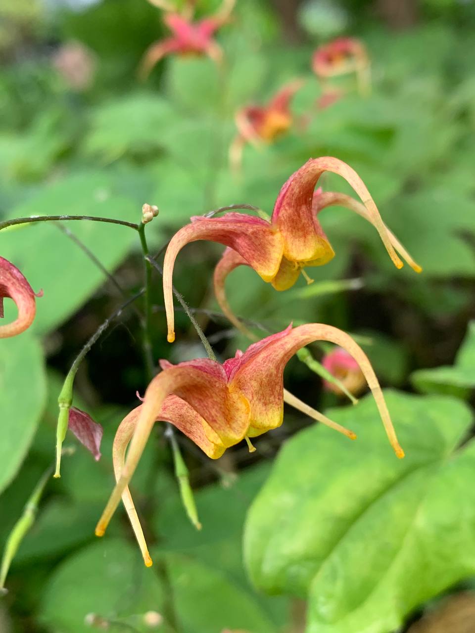 Высота 40 см.Яркая, красочная горянка. Цветы красно-желто-оранжевые. Околоцветники красно-розово-малиновые, шпорцы загнуты вниз медно-кремовые, крупный венчик цветка желто-оранжевый. Цветы располагаются над листьями.