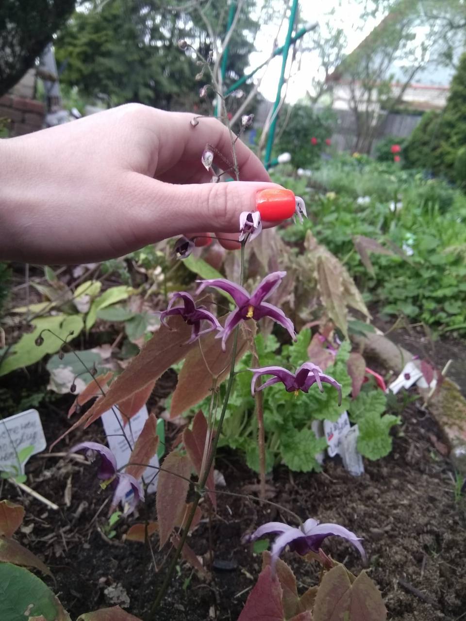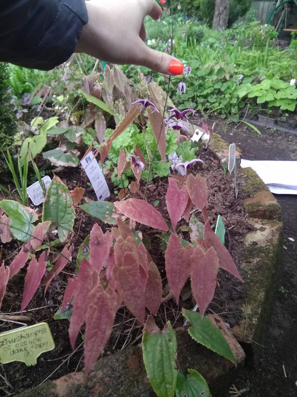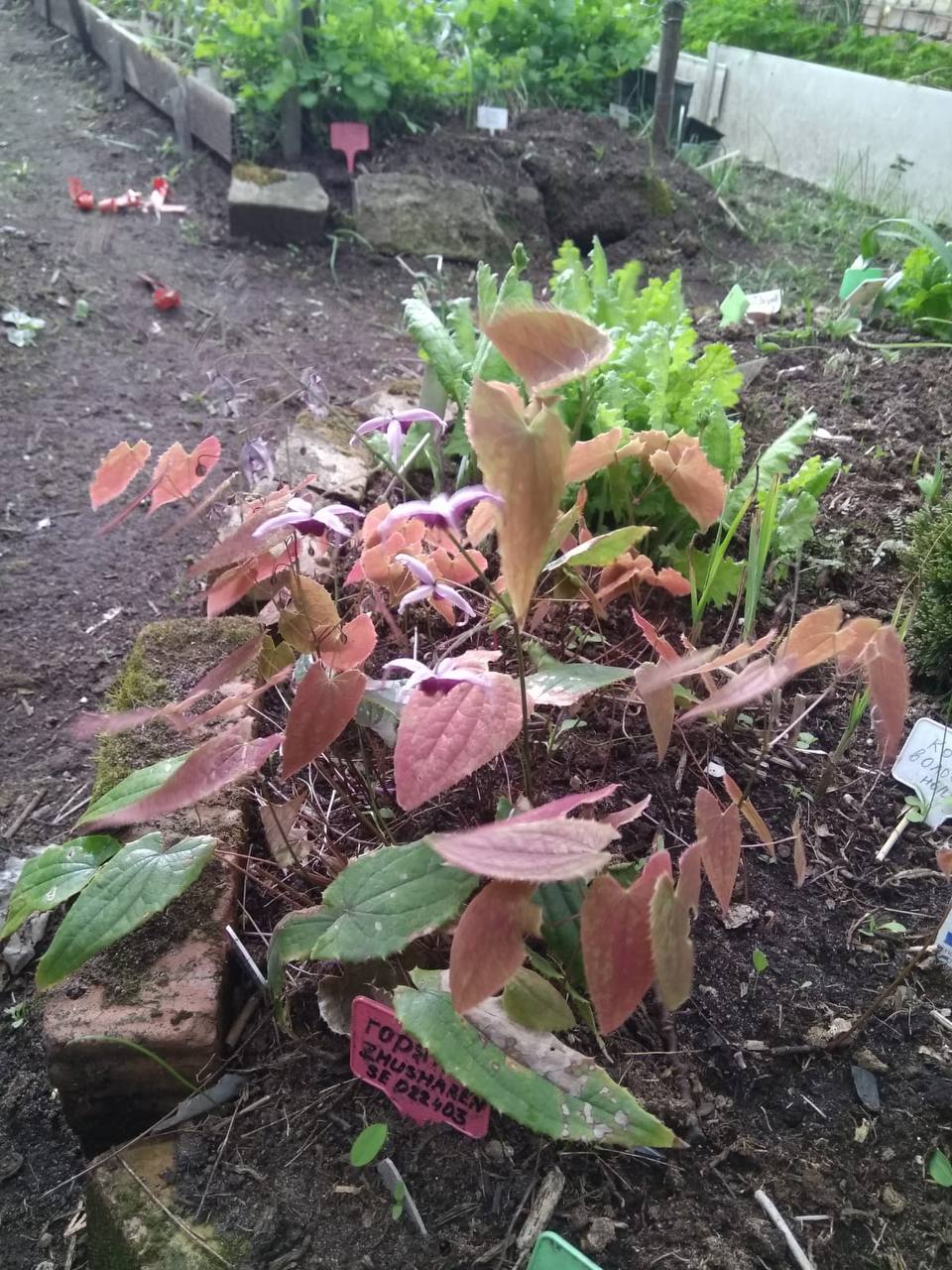 h-40 см, цветы фиолетово-бело-розовые. Лист коричнево-зеленый с зубчатым краем