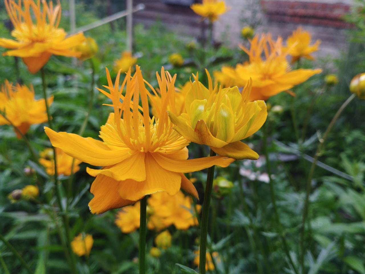 Высота 80см, цветы крупные, полумахровые, ярко-оранжевые. Листья зеленые, резные, ажурные. Цветет в первой половине лета. Растет на солнце и в полутени.