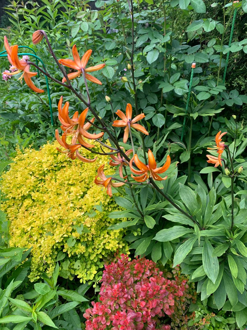 У нас растет в композиции с туей Смарагд, маленьким барбарисом Тунберга Golden Zwerg , барбарисом Тунберга Admiration, с желтой розой и княжиком Purple Surprise.