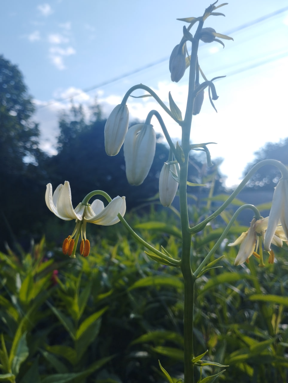 Высота 120 см. Цветы диаметром 7 см., белые с лимонно-желтым горлом и желтыми тычинками.
