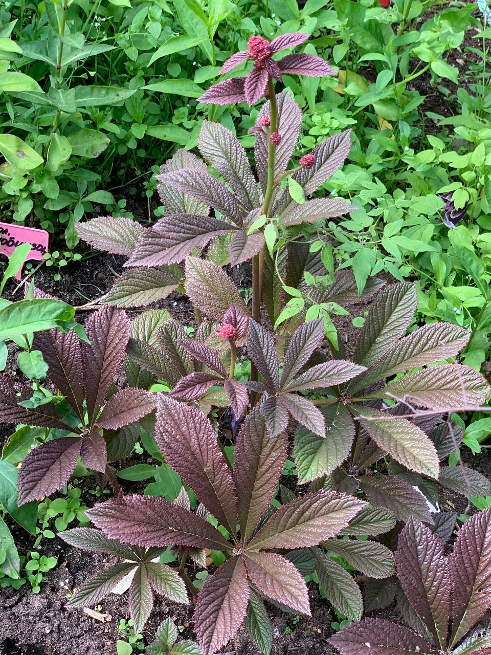 Высота 80см, цветы ярко-розовые, листья шоколадно-бронзово-коричневые