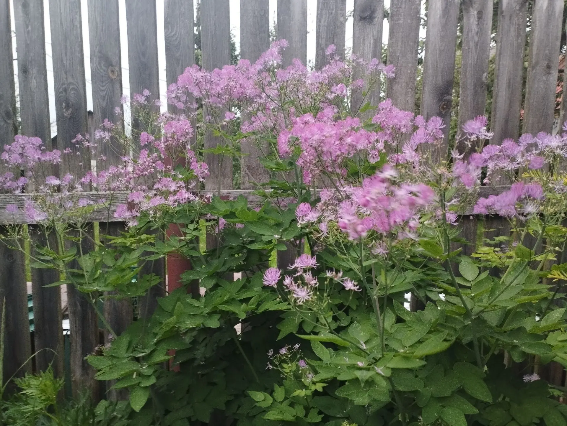 Высота 150см, цветы ярко-розово-лиловые, стебель черные, листва ажурная, цветет июнь-июль.