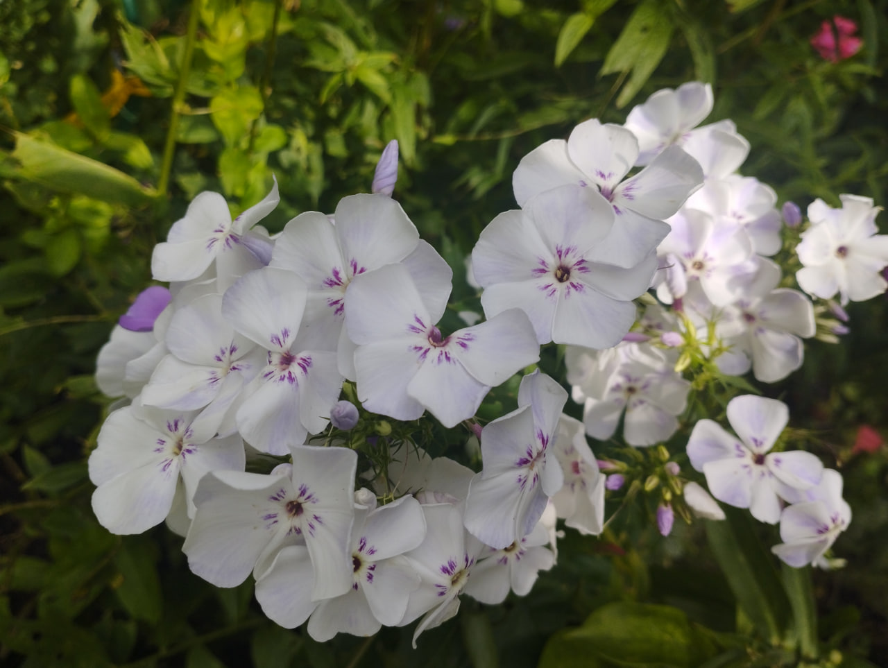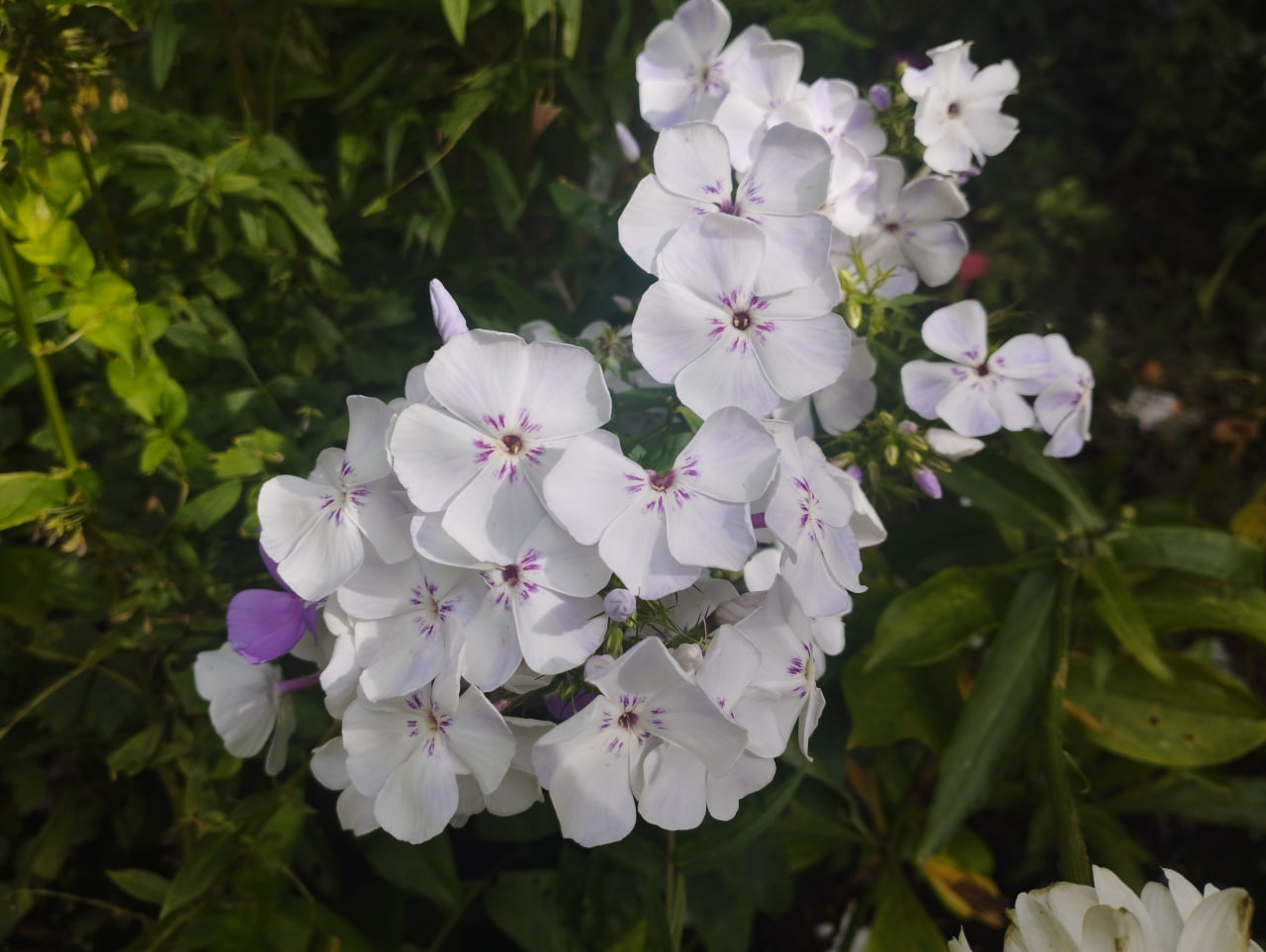 3,8-4,0; С. Цветы белые с еле видимыми сиреневыми тенями. Венчик цветка колесовидный, слегка волнистый, лепестки немного перекрываются. В центре прерывистое фиолетовое колечко в виде пары "усиков" по каждому лепестку. Трубка фиолетовая, бутоны сиреневые. Вечером сиренево-фиолетовые оттенки превращаются с голубовато-синие. Соцветие полуокруглое, среднего размера и плотности. Куст прямостоячий, прочный, быстро разрастается.