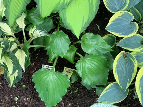 Высота 30-40 см. Листья сине-голубые с кремово-желтов окантовкой. Плотные. Подходит для полу-тени, на солнце будет зеленеть.