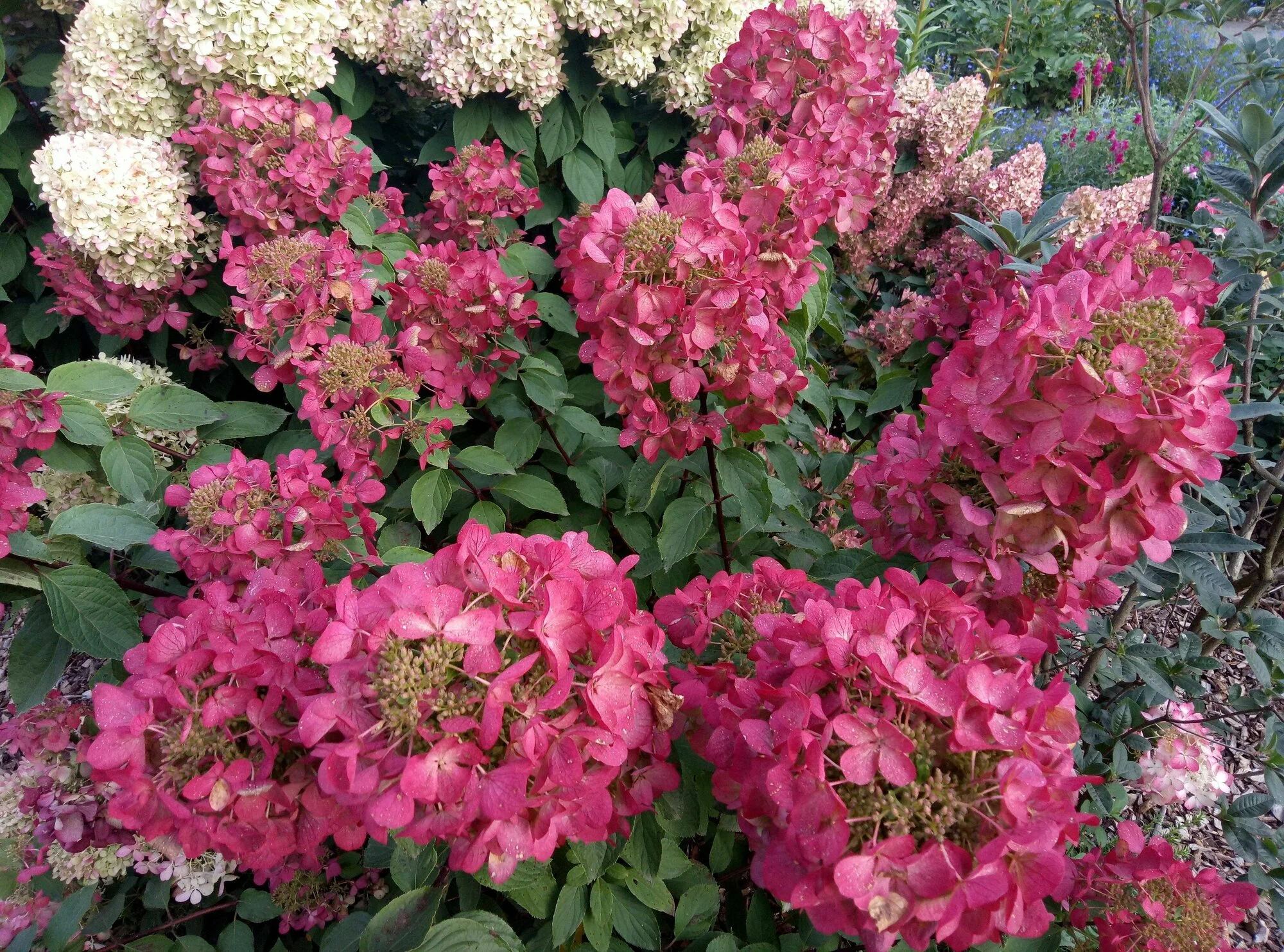 Высота 150см, цветы вначале белые потом красно-пурпурные, крупные, листья оранжевые, цветет с июля по октябрь