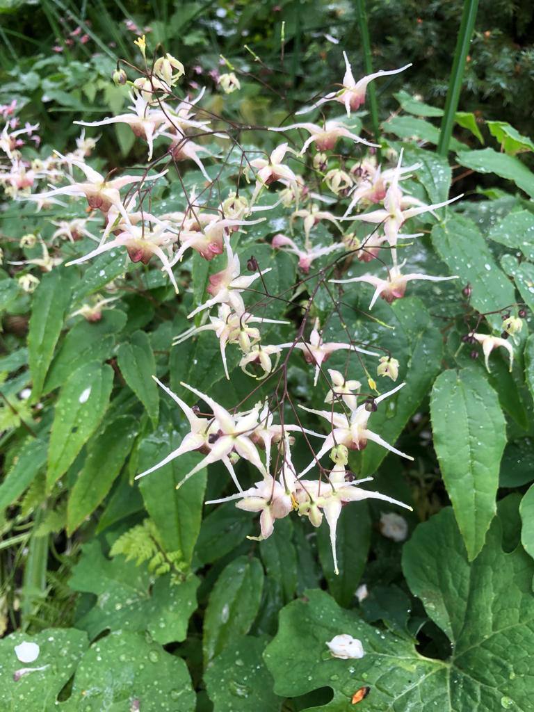 Высота 40см, цветы белые с сиреневым носиком, листья коричнево-зеленые, цветение май-июнь