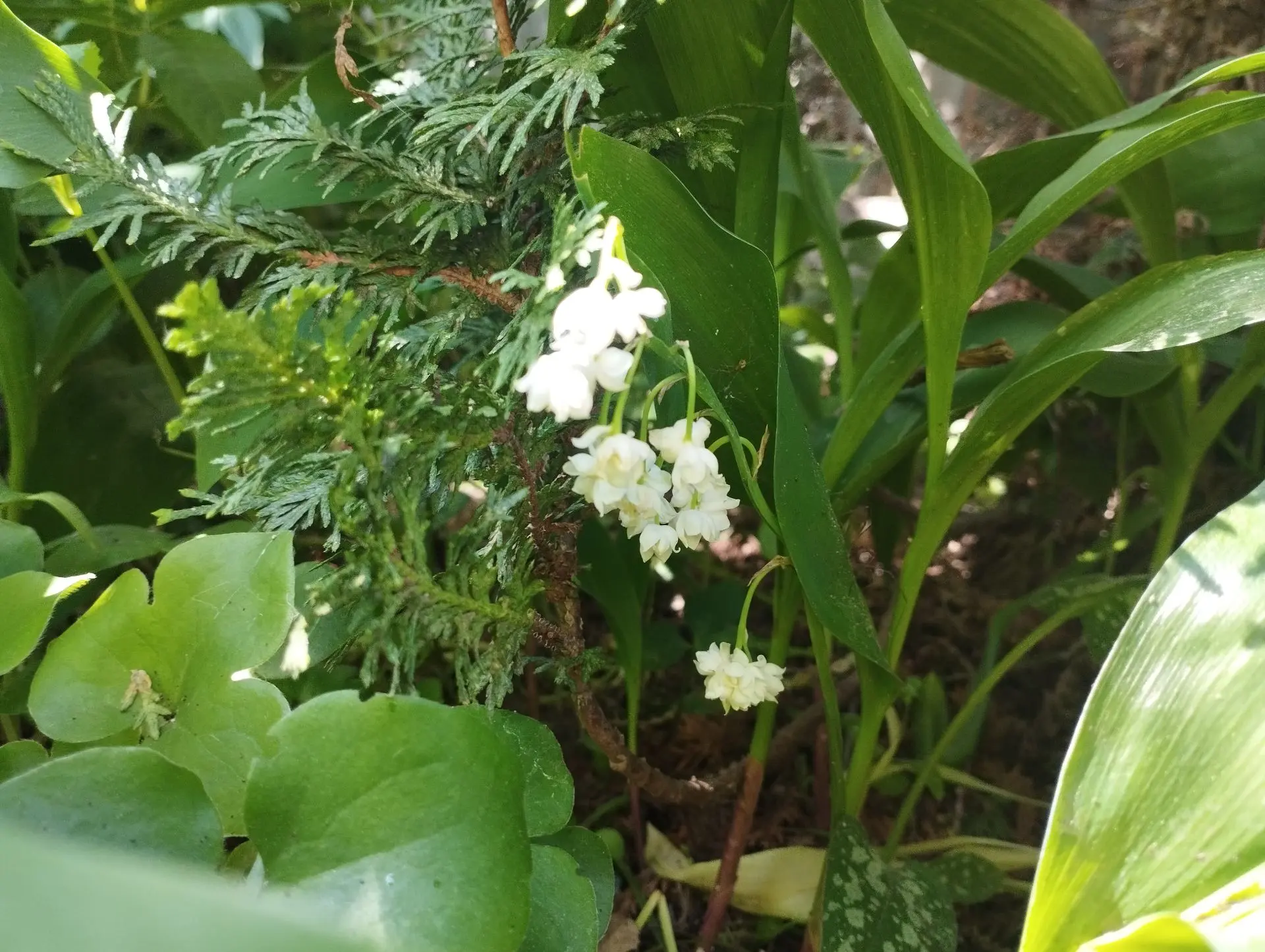 Цветочная композиция (ландыш Hardwick hall, медуница, купальница Алтайска, тис) в саду Гриндачи 2023г.