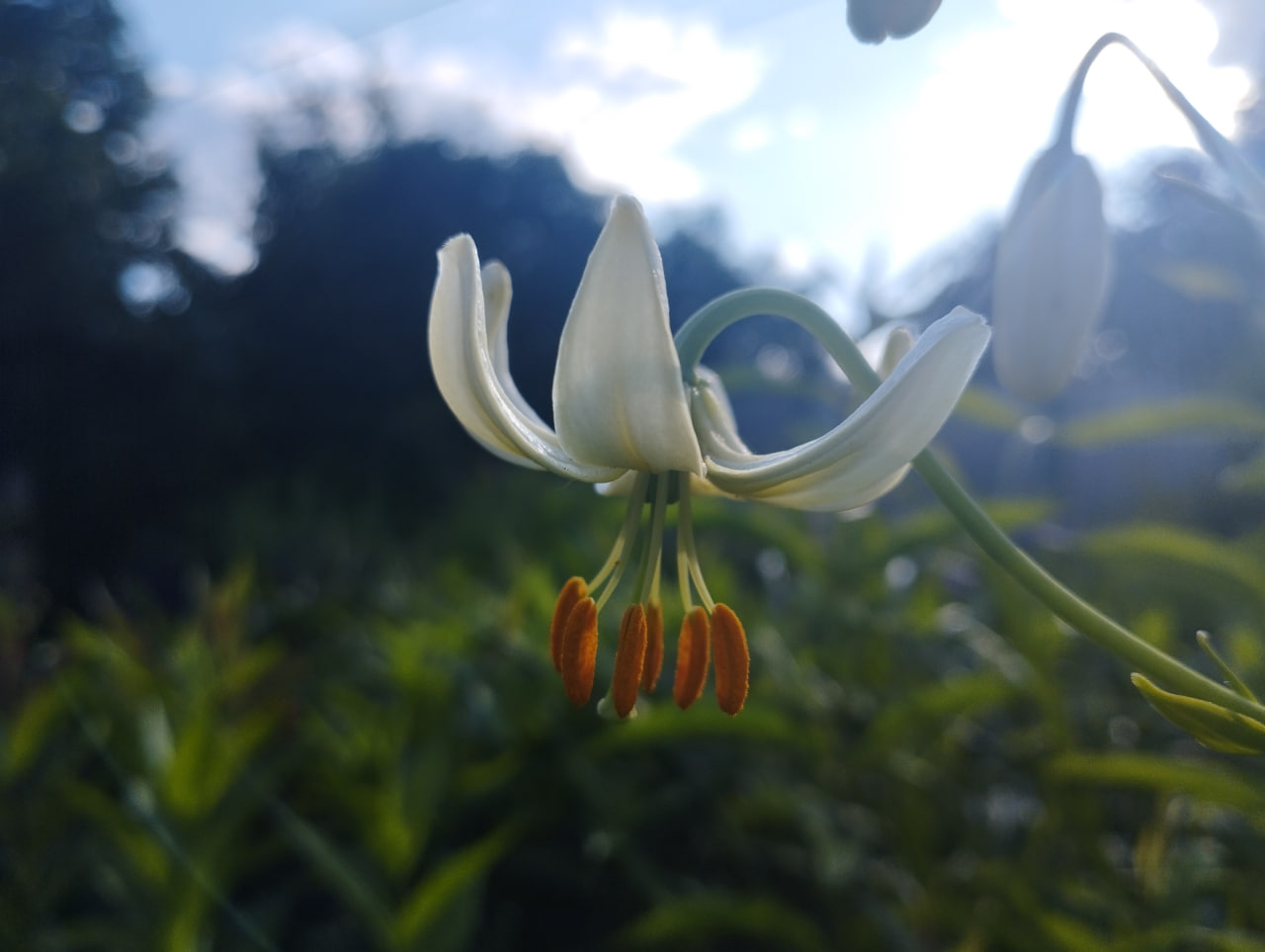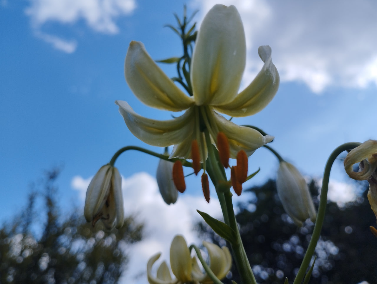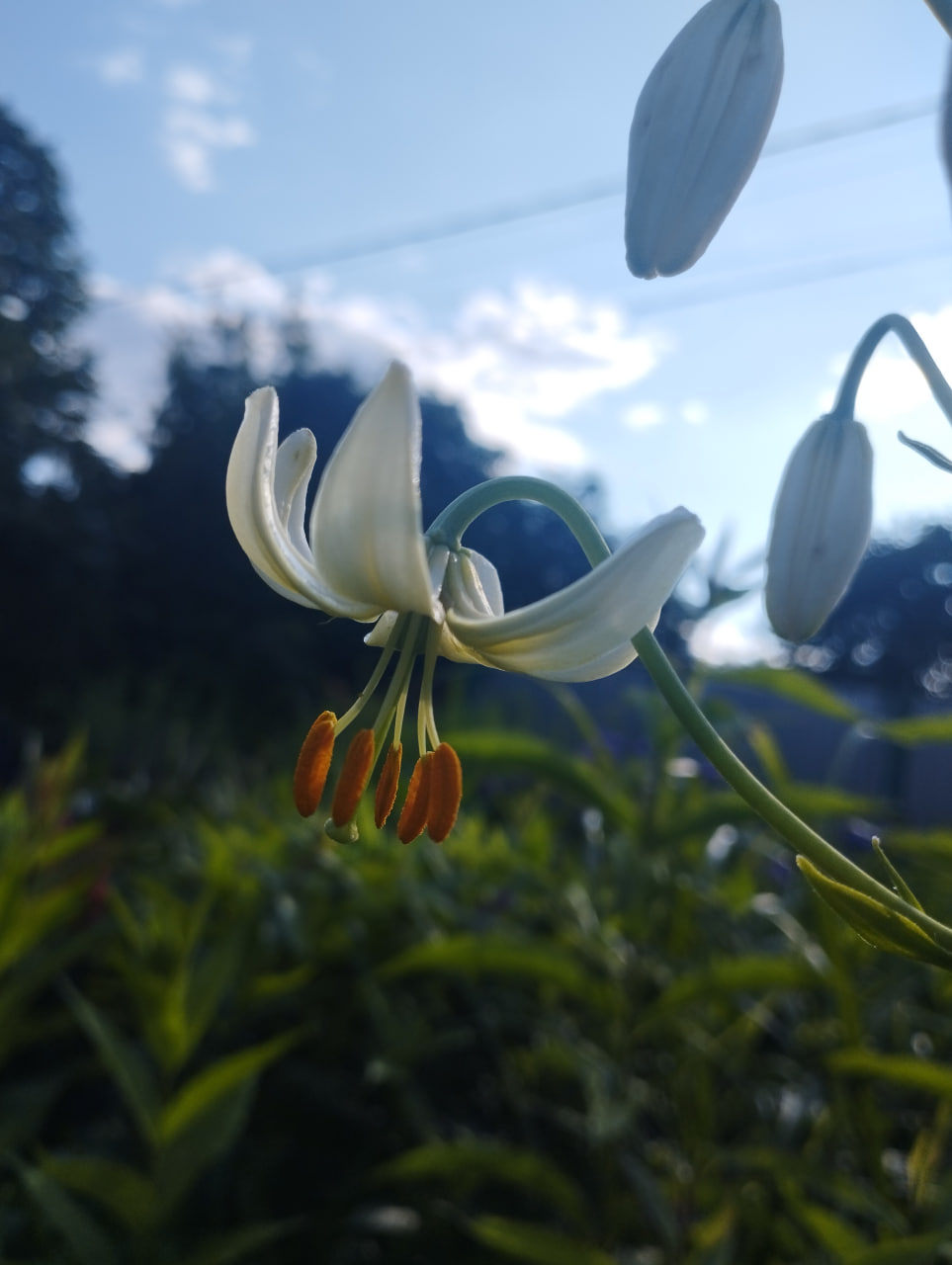 Высота 120 см. Цветы диаметром 7 см., белые с лимонно-желтым горлом и желтыми тычинками.