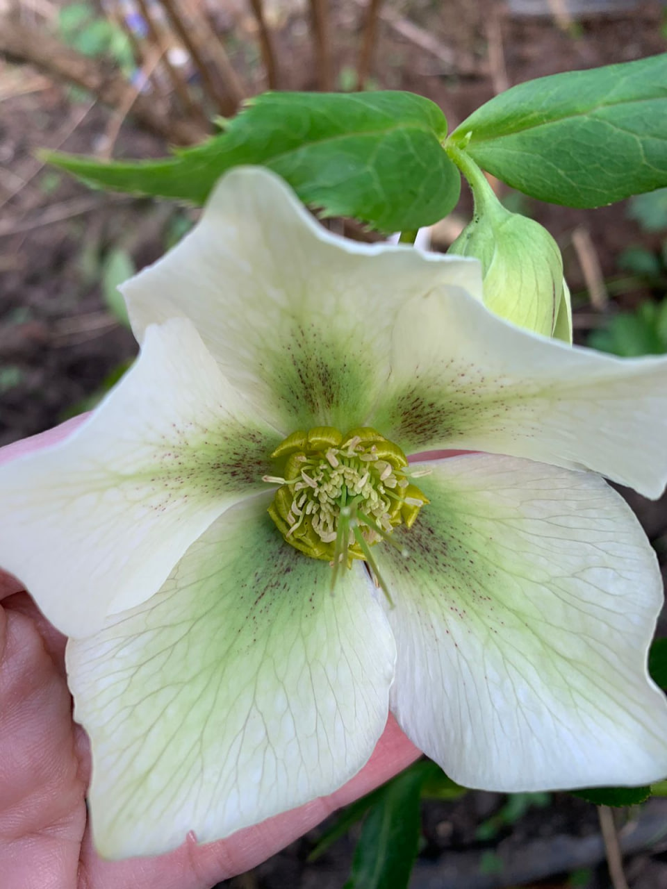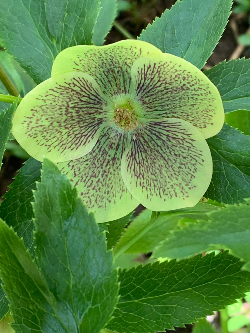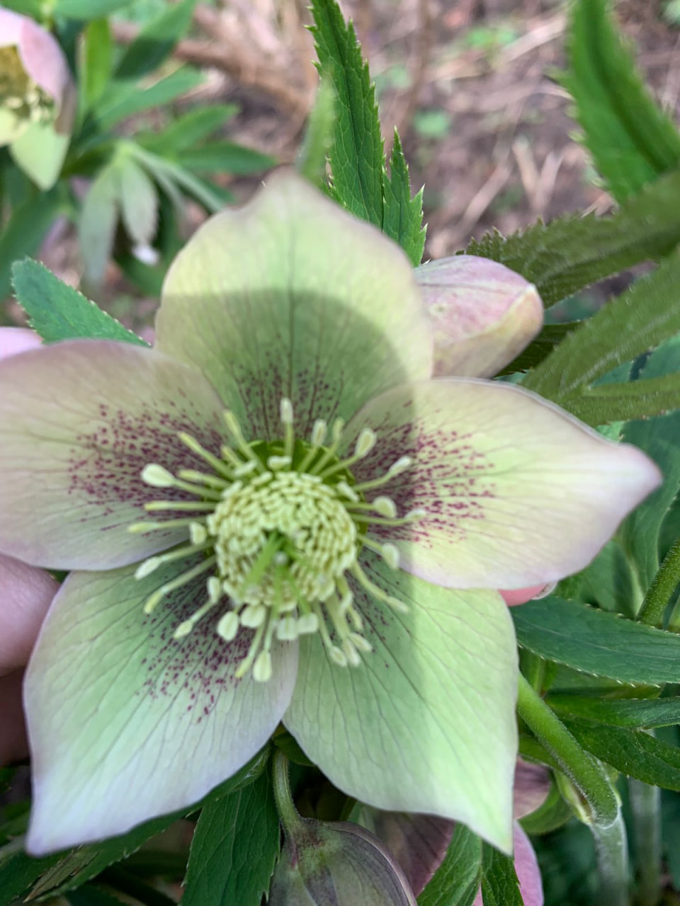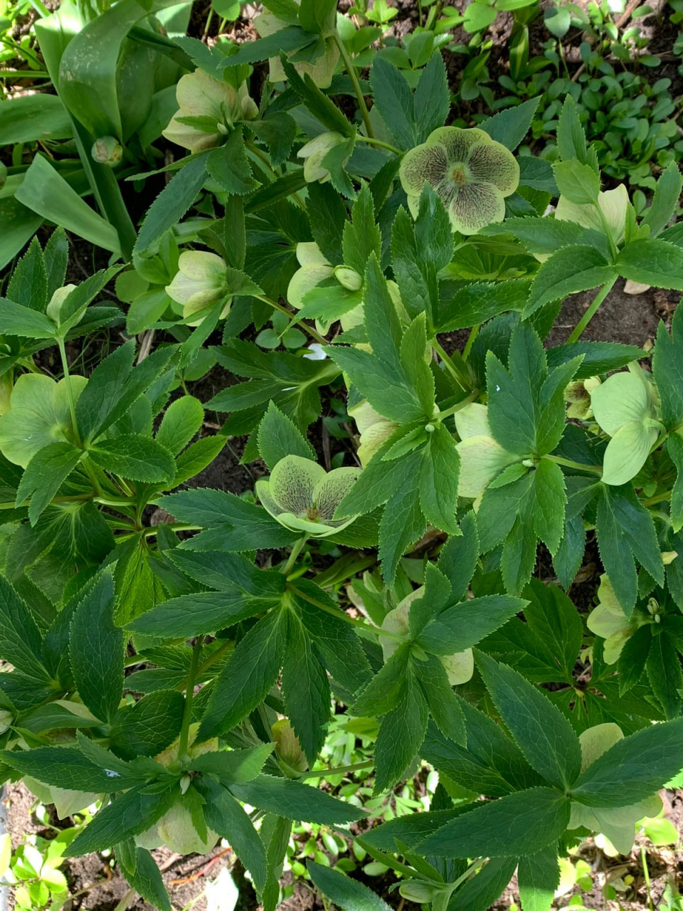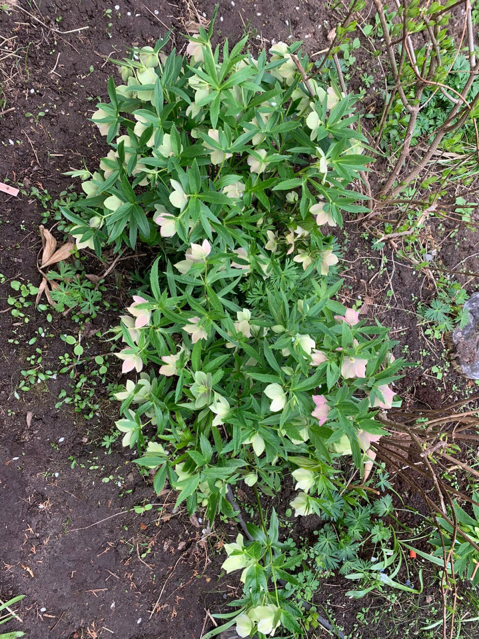 h-50 см, цветы бело-зеленые с розоватой окантовкой и красным крапом, не махровые. Листья зеленые, декоративны весь сезон.