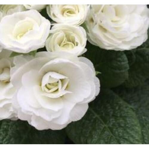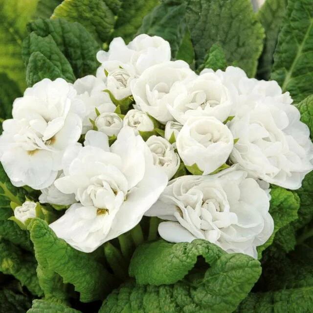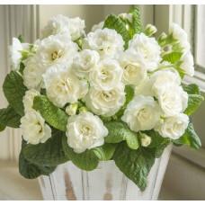 Высота 15 см. Цветы ярко-белые, махровые, крупные.